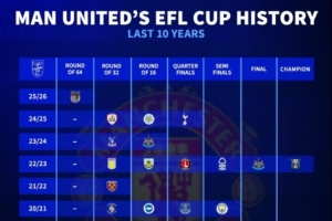 最近十年,曼聯(lián)曾在16-17賽季以及22-23賽季獲得該項賽事冠軍,此前最差戰(zhàn)績是18-19賽季第三輪不敵德比郡,21-22賽季第三輪不敵西漢姆。