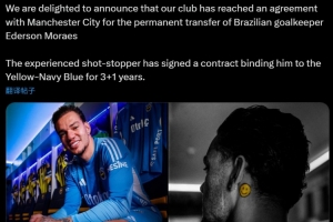 “我們非常高興地宣布,俱樂部已與曼城就巴西門將埃德森的永久轉(zhuǎn)會(huì)達(dá)成協(xié)議。這位經(jīng)驗(yàn)豐富的門將已與我們簽署了一份3+1合同?!?/p>